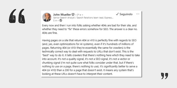 De vez em quando encontro pessoas perguntando se páginas 404 são ruins para o site delas e se precisam “corrigir” esses erros de alguma forma para SEO. A resposta é claramente não.
