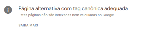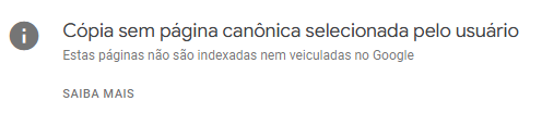 O que significa: o Google detectou que essa página é uma versão duplicada de outra e respeitou a indicação de canônica. Isso é positivo: quer dizer que o buscador entendeu qual URL você considera principal.